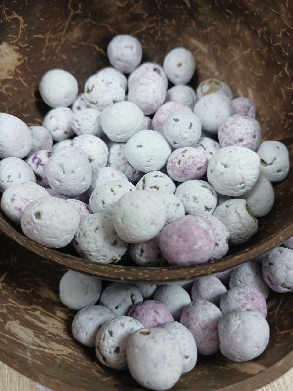 Повітряні амарантові кульки, які вкриті зверху глазурью з кокосового йогурту. Дуже легкі, хрумкі, та в міру солоденькі. Мають приємний аромат та смак кокосу.
