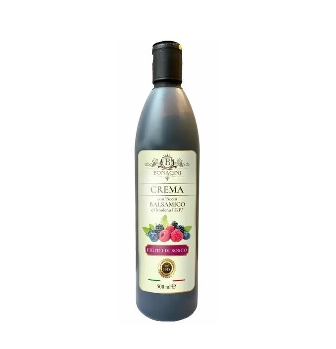 Ніжний бальзамічний оцет поєднується з солодко-кислим смаком ожини, чорниці та малини, створюючи баланс свіжості та аромату. Особливості продукту: Витончена комбінація бальзамічного оцту та лісових ягід. Густа кремова текстура, зручна для декору та подачі. Ідеально підходить до м’ясних страв, салатів, сиру, десертів та морозива. Додає стравам яскравого смаку та ресторанного вигляду.