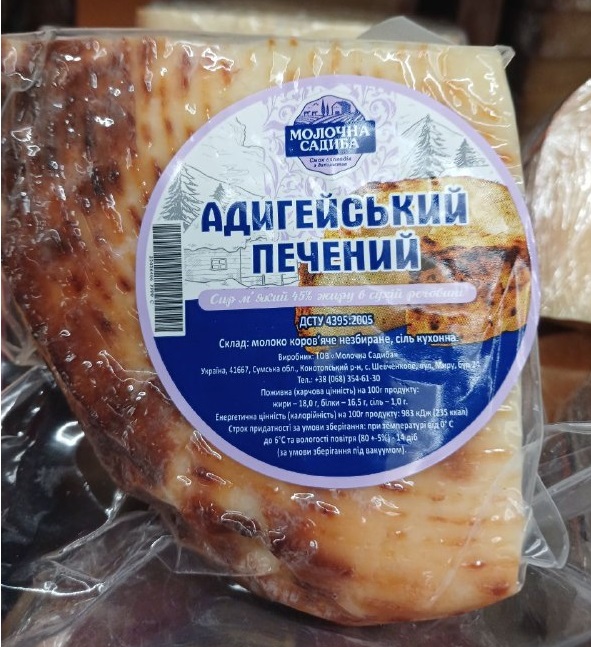 Адигейський печений сир, це надзвичайна смакота яка має натуральний склад. А саме: молоко коров’яче незбиране, сіль кухонна. Все, ніяких додаткових домішків. Вміст солі в данному сирі складає 1 грам. Шматочки вагою в межах від 400 до 450 грам, вартість фіксована за шматочок.